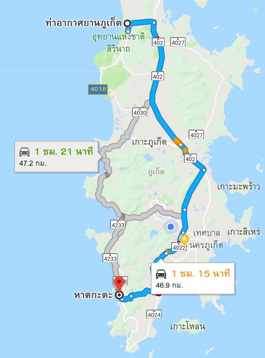 เส้นทาง : ผ่าน ถนนหมายเลข 402  ท่าอากาศยานภูเก็ต ตำบล ไม้ขาว อำเภอ ถลาง ภูเก็ต 83110 ใช้ ถนนหมายเลข 402 และ ถนนหมายเลข 4024 ไปทาง ซอย ปากปาง มุ่งไป ตำบล กะรน 1 ชม. 11 นาที (46.7 กม.) เลี้ยวซ้าย เข้าสู่ ซอย ปากปาง 37 วินาที (170 เมตร) หาดกะตะตำบล กะรน อำเภอเมืองภูเก็ต ภูเก็ต 83100